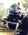 We took a 2 1/2 hour drive to Harshaw WI for a Halloween Miniature Horse fun show! We had a glorious day, 80 degrees and the sun shining! Wonderful! First we stopped in a town called Rhinelander and when I saw why I wanted to go kicking and screaming in the other direction! There was a big horrible black beast with red glazed eyes, sharp pointy teeth, tusks and claws and sharp spines along his back! They wanted my picture with this horrible nasty thing! Then I looked and there was Sarah, sitting on his head! She had tamed the beast, this beast called a Hodag! So I figured if Sarah would hold me I would be brave and get my picture taken. Turns out the Hodag was really quite a friendly guy! He greets everyone into his town and is really quite famous all over the northwoods! I also found out that he is Wisconsin's Blarney Stone, get your picture taken kissing him and you have good luck! It was hard to say goodbye but we had a horse and goats in the van and needed to hit the road.